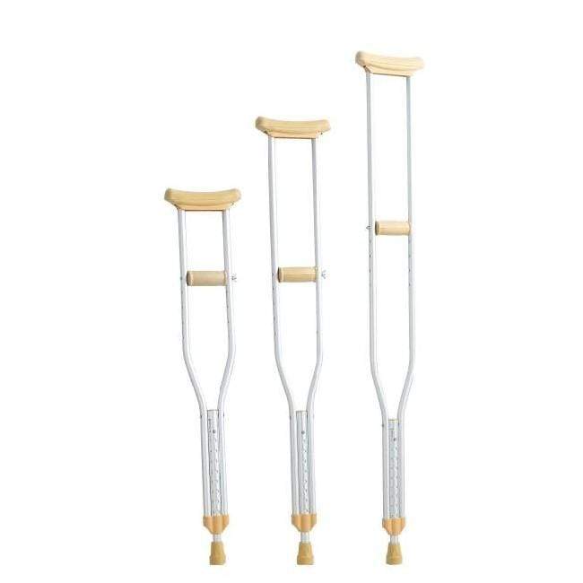Underarm Crutches (pair) offer push button height adjustment in a lightweight anodised aluminium frame, with foam underarm pads and adjustable foam handgrips.