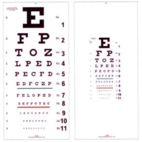 Standard Snellen Chart on styrene 11x23 inches with rounded corners (27.5x60 cm). Includes lines for 20/10 20/13 20/15 20/20 20/25 20/30 20/40 20/50 20/70 20/100 and 20/200. Includes 20 Ft Snellen and M notations. Green bar at 20/30 and red bar at 20/20.