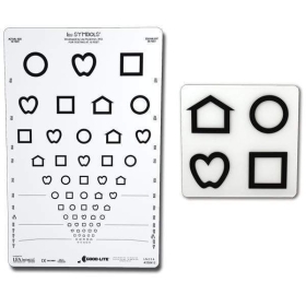 LEA SYMBOLS pediatric vision chart with 10ft and 20ft foot notations only. Proportionally spaced (logMAR) lines line sizes range from 20/125 to 20/8 (6/38 to 6/2.4) equivalent. Set includes response key and instructions. This chart can either be wall mounted or used in an ESV1200 ESV1500 or a Model A illuminated cabinet.