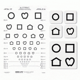Proportionally spaced (logMAR); line sizes range from 20/125 to 20/8 (6/38 to 6/2.4) equivalent, 0.16 to 2.50. This chart can either be wall mounted or used in an ESV1200 or Model A illuminated cabinet. Includes response key, training cards, and instructions.