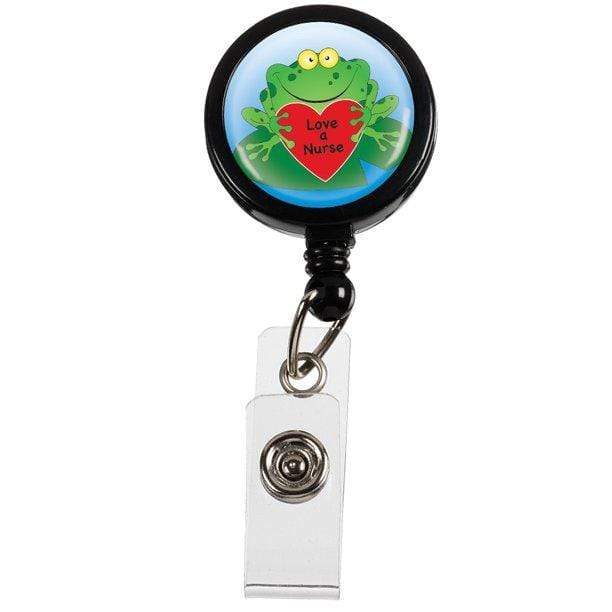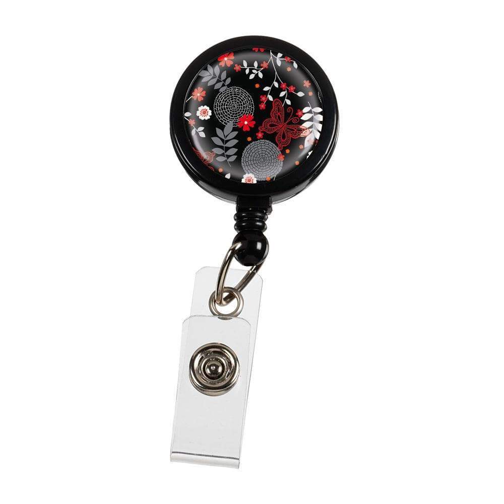 Metal clip on back enables fastening to apparel. Button-snap ID holder can also be used to carry keys.