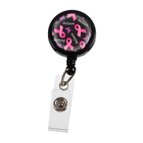 Metal clip on back enables fastening to apparel. Button-snap ID holder can also be used to carry keys.