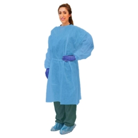 Isolation Gowns: This lightweight gown opens down the back and includes a waist and neck tie to firmly secure the garment closed. The cuffs are latex free elastic to comfortably gather the sleeves at the wrists and ensure the cuffs of gloves easily cover. Ideal use for the treatment of patients where a change of outer garment is required at each contact.
