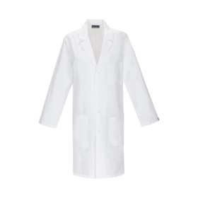 A 40" Unisex lab coat features two roomy patch pockets, a chest pocket with a pencil stitch, and vented back.
