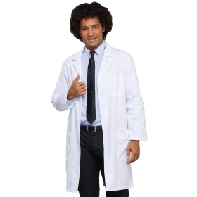 A 40" Unisex lab coat features two roomy patch pockets, a chest pocket with a pencil stitch, and vented back.