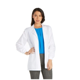 A Traditional Classic fit, notched lapel lab coat doubles as a warm-up with its rib knit cuffs, two button trimmed patch pockets, and an extra utility pocket. Seams shape the front and an elastic inset with buttoned tabs shape the back. Center back length: 30"