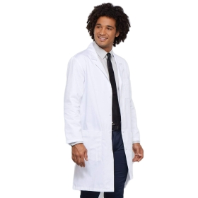 A Unisex lab coat has side access openings, two roomy patch pockets, a chest pocket with a pencil stitch, and vented back. Center back length: 40"