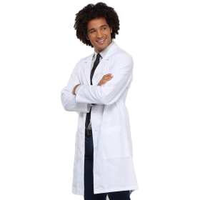 A Unisex lab coat has side access openings, two roomy patch pockets, a chest pocket with a pencil stitch, and vented back. Center back length: 40"