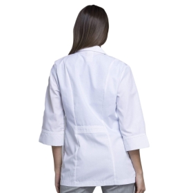 A Modern Classic fit button front lab coat is edged with lace detail on the collar, notched lapel and center back belt. Princess seaming front and back and two patch pockets, 3/4 length sleeves and cuffs. Center back length: 29".