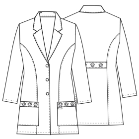 A Modern Classic fit, notched lapel lab coat features front and back princess seams for flattering fit and front patch pockets. Pretty daisy embroidery detail on the pocket band and back belt complete this feminine look. Center back length: 29".
