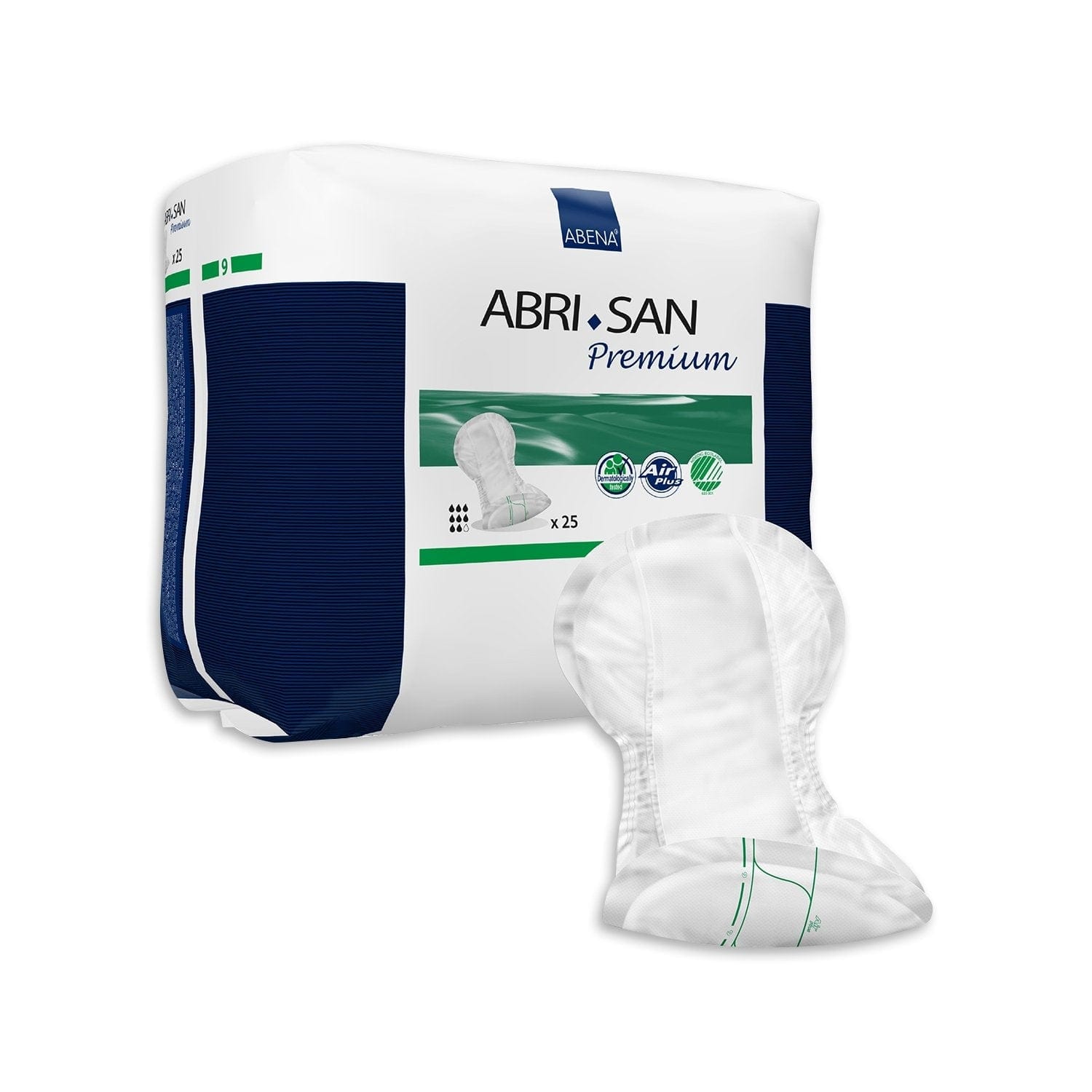 Abena Abri-San 9 Premium Green is an anatomically shaped pad for light to heavy incontinence. The incontinence pads are designed with a soft textile-like top and back sheet that allows the skin to breathe and stay dry, cool and healthy in all situations. These products offer unique protection against leakage with super soft and flat lengthwise barriers. An adhesive strip on the back of the pad secures the pad to the underwear. It has Abena’s Top Dry system that allows the user to feel dry and comfortable, while letting the skin breathe.