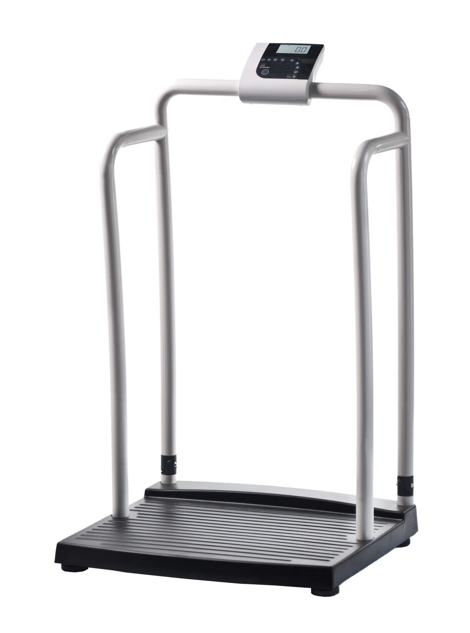 Sesigned for the bariatric practice. Its unique design and enhanced robust structure assures safety and comfort for large people. Side rails gives support to unsteady patients and movement compensation technology eliminates involuntary movement. Assembly is effortless – a pop-up hinge joint easily sets the back rail upright and the side rails slide in. Two heavy-duty wheels make it easy to easily move the scale.