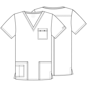 A Unisex V-neck features double needle stitching. The chest pocket features an instrument holder. Also included are two patch pockets, an additional instrument/cell phone pocket on right side, back yoke and side vents. Center back length: 28"