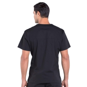 A Mens V-neck top features a chest pocket with instrument loop, a back yoke and side vents. Center back length:28