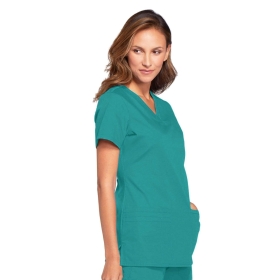 A Contemporary fit V-neck top features front patch pockets (the right with an exterior pocket and pen slot, the left with a hidden instrument loop), side vents and stretch rib knit back panels for movement and extra comfort. Center back length:27