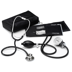 Economical Aneroid Sphygmomanometer / Dual Head combination kit. The stethoscope features a lightweight aluminum chestpiece with an inlaid non-chill ring. An excellent stethoscope for general auscultation. Black only.