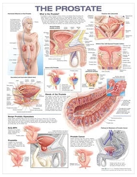Explains and hormonal influence on the prostate. Detailed view of the glands of the prostate and explanation. The chart also shows and describes benign prostatic hyperplasia, prostatitis, digital rectal exam, prostate cancer, and pathways of prostate cancer spread.